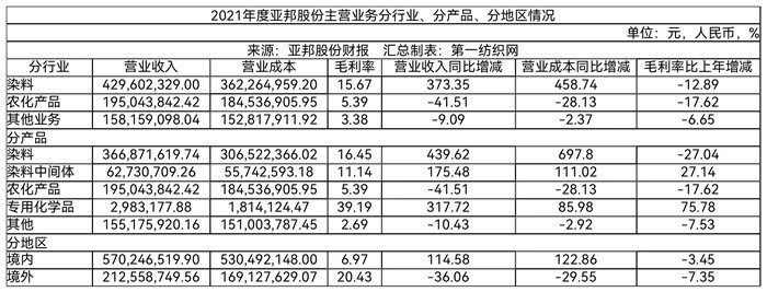 公开资料显示,亚邦股份是通过整合亚邦集团公司所有染料相关业务于2006年2月成立的股份制企业,公司主要从事纺织染料及染料中间体的研发、生产、销售和服务,布局高端蒽醌染料,是全球最大的蒽醌结构分散染料和还原染料生产企业,公司主要产品在国内处于领先地位,在产品定价上具有一定的话语权和主导权。