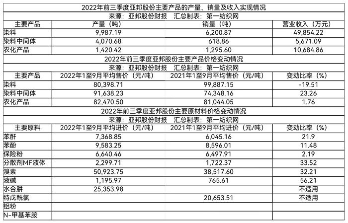 而受国内疫情和海外需求增长放缓等因素影响,前三季度纺织制造企业收入增速趋缓。特别是进入三季度以来,由于棉价回落,纺企订单价格有所下调,同时滚动消化前期高价原材料库存,因此纺织企业利润承压,同比有所下滑。就亚邦股份来看,一是受行业竞争、市场供给、下游需求变化等因素影响,公司产品价格出现较大波动,给亚邦股份运行带来较大压力;二是近年来,省、市化工行业安全环保提升整治要求对主要产能造成严重影响,亚邦股份所在连云港生产区的主要产能长期停产进行提标改造,截至目前,除两家染料工厂复产外,两家退出搬迁,三家尚未复产,给亚邦染料的日常稳定和经营业绩带来巨大挑战;此外,受俄乌战争、原油价格波动以及行业政策调控等因素影响,公司基础原材料价格出现波动;同时,由于环保治理投入的增加,环保治理成本和运行费用也逐年增加,也将抬高亚邦染料的产品成本;员工工资在成本中的比重逐年提高。