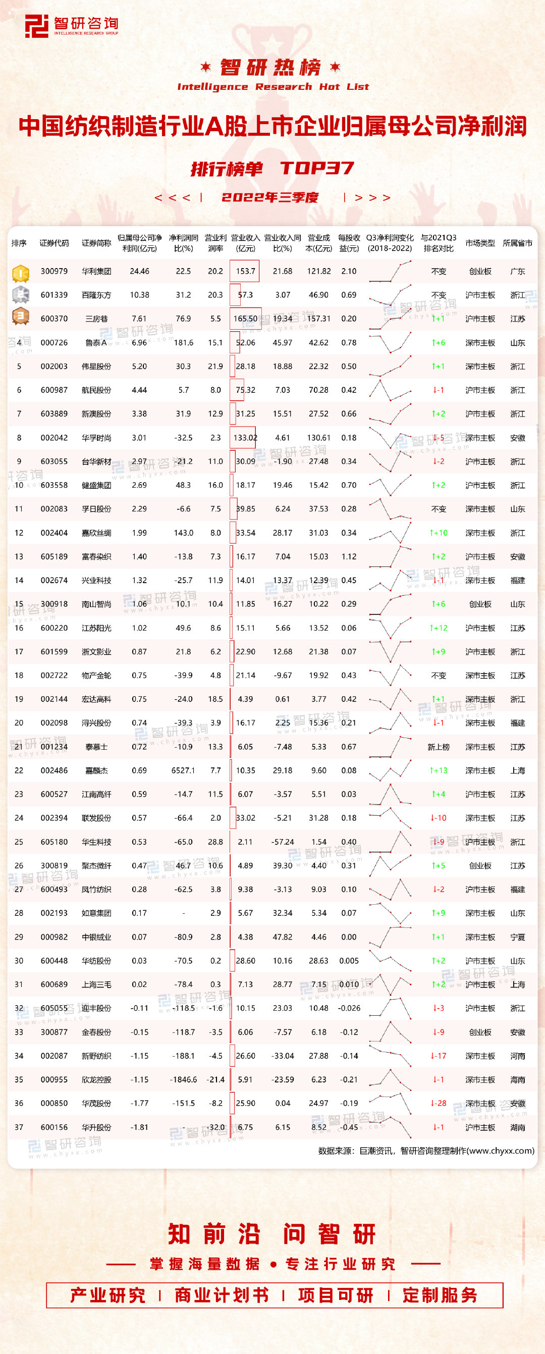 37家纺织制造A股上市企业2022年第三季度总计归属母公司净利润为81.27亿元,同比增长7.08%(2021Q3共有36家纺织制造上市企业公布数据,总计归属母公司净利润为75.89亿元),总计营收1138.79亿元。