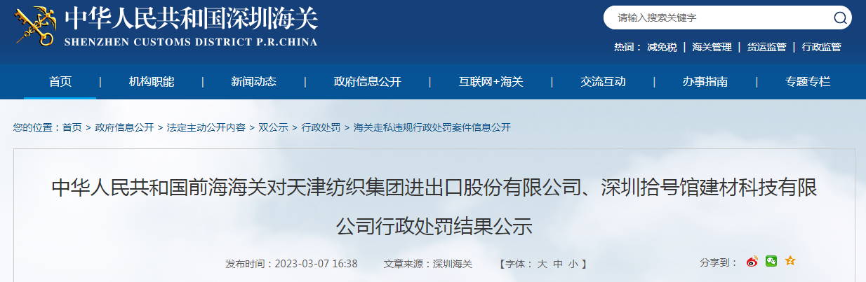 中国质量新闻网讯?近日,前海海关发布对天津纺织集团进出口股份有限公司、深圳拾号馆建材科技有限公司行政处罚结果公示。