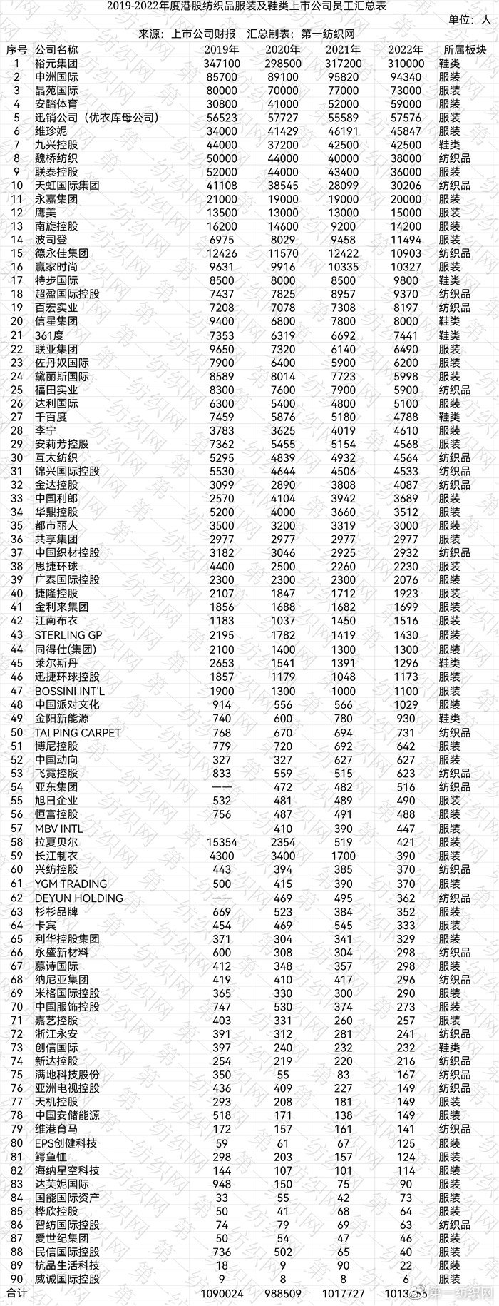 据第一纺织网统计,沪深两市142家纺织服装、化学纤维及纺织机械设备类上市公司2022年员工总数达68.87万人,90家在港上市的90家纺织服装公司员工则超百万,达101.32万人,以下为具体情况。(第一纺织网 martin)