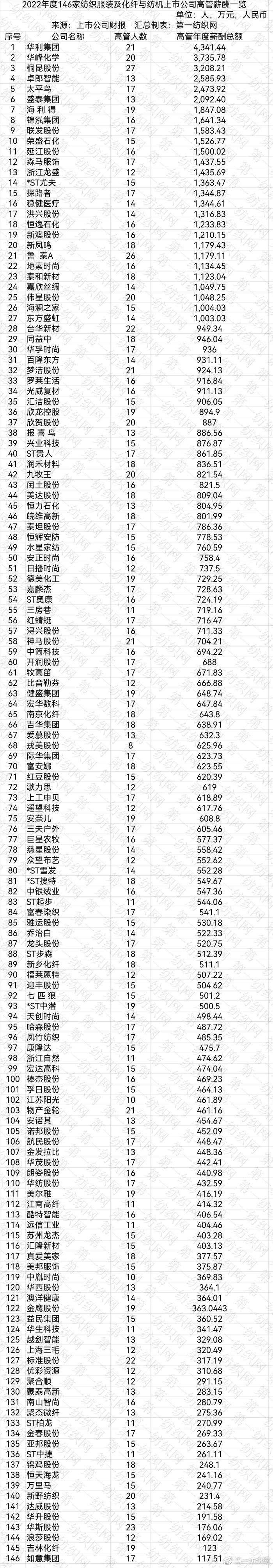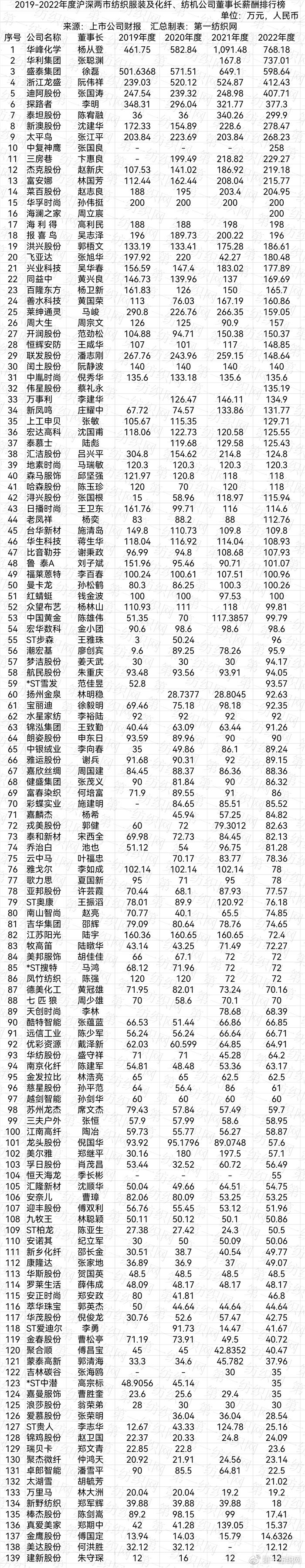 随着A股公司披露2022年年报,董事长薪酬引人关注,第一纺织网据财报获悉,139家沪深两市纺织服装及化纤、纺机公司已披露年报显示,有51名董事长2022年年薪超过100万,其中有16人的年薪超过200万。