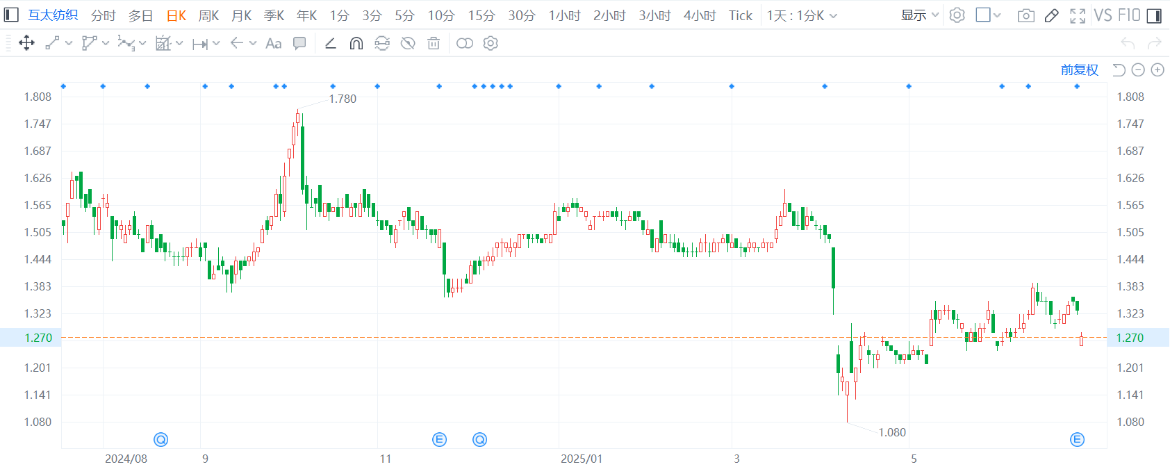 格隆汇6月27日|互太纺织(1382.HK)今日低开6.02%报1.25港元,股价创6月4日以来阶段新低,全天维持低位震荡走势。互太纺织昨日晚间公布截至今年3月31日止财年业绩,期内集团收入约为50.58亿港元,同比增加6.7%,乃由于销量增加11.3%及平均售价减少4.5%的综合影响所致;公司权益持有人应占溢利约为1.68亿港元,同比增加0.3%;权益持有人应占每股盈利0.12港元。