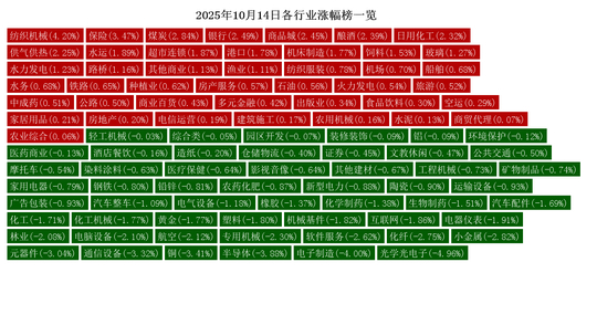 今日涨幅居前的行业有:纺织机械(4.2%)、保险(3.47%)、煤炭(2.84%)、银行(2.49%)、商品城(2.45%)、酿酒(2.39%)、日用化工(2.32%)、供气供热(2.25%)、水运(1.89%)、超市连锁(1.87%)。