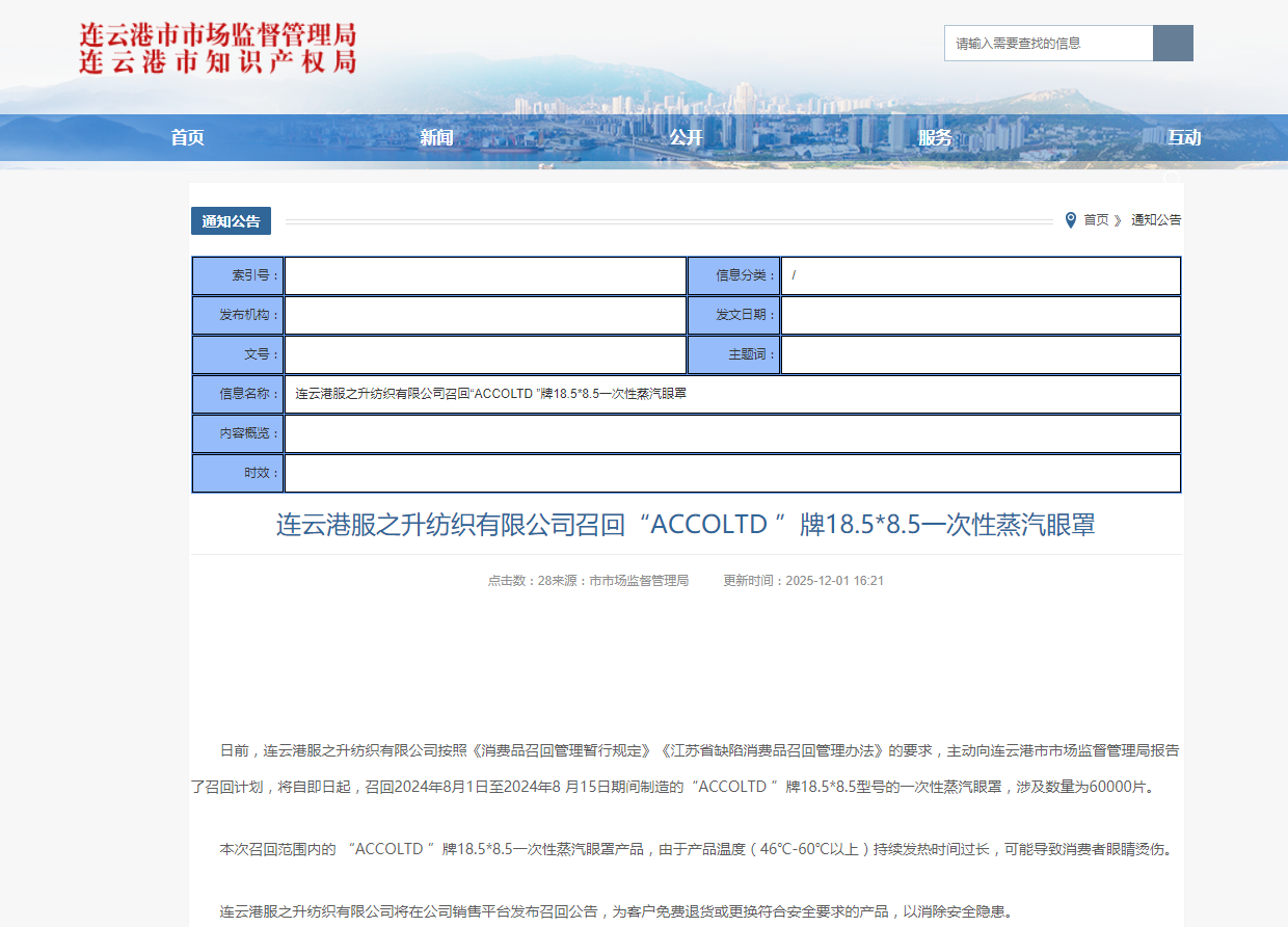 中国质量新闻网讯 据连云港市市场监管局网站消息,日前,连云港服之升纺织有限公司按照《消费品召回管理暂行规定》《江苏省缺陷消费品召回管理办法》的要求,主动向连云港市市场监督管理局报告了召回计划,将自即日起,召回2024年8月1日至2024年8月15日期间制造的“ACCOLTD”牌18.5*8.5型号的一次性蒸汽眼罩,涉及数量为60000片。