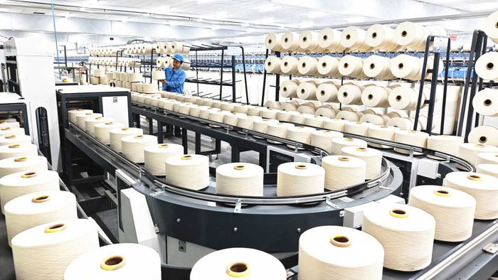 12月5日,工人在位于新疆阿瓦提县的新疆精一纺织科技有限责任公司纺织车间作业。近年来,阿瓦提县大力推进纺织产业转型升级,积极引入智能化生产线,推动纺织产业向高端化、绿色化迈进。