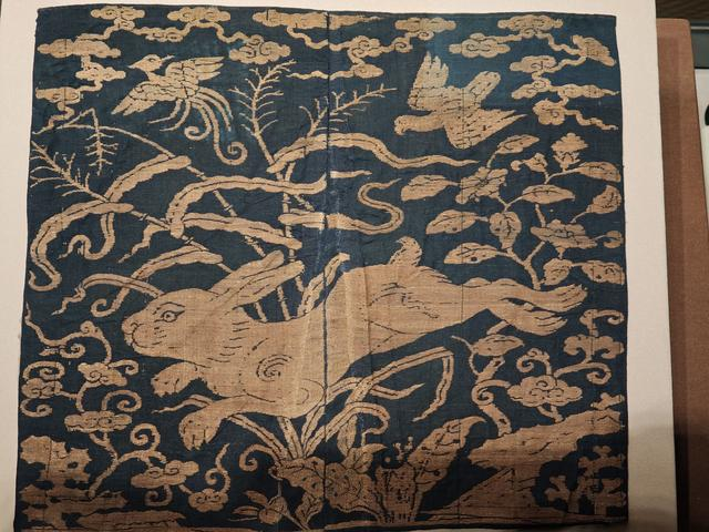 “融”是展览主线之一。一件兔纹织金锦上,卷草地上交错排列滴珠窠纹样,中间装饰兔纹,体现了游牧文化与佛教、道教的交融。