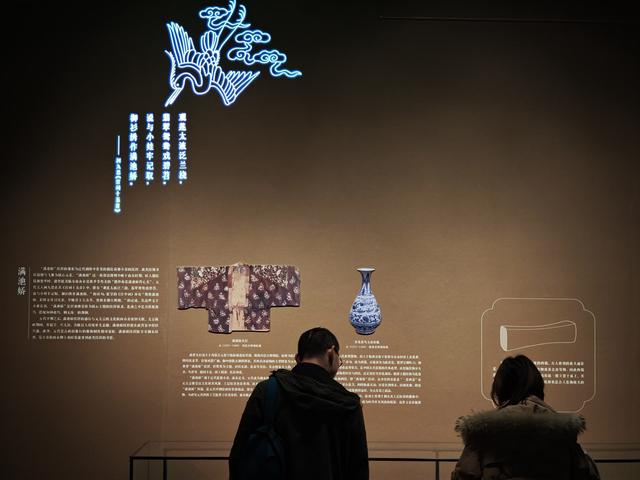展厅里,大到棉袄、被面,小到香囊、衬垫,历经600余年颜色依旧绚烂。策展人揭秘,文物出土后,经由首博保护部专家悉心修复,才得以重焕光彩,展现一针一线的故事。