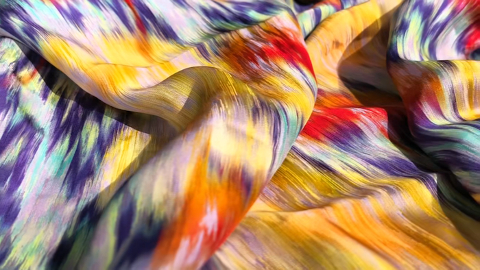 “艾德莱斯独特的核心技艺就是先染后织,通过扎经染色,在织造前便为丝线赋予斑斓色彩,形成如旋律般流动的纹样。”聊起艾德莱斯,上海市纺织科学研究院有限公司低碳材料部副经理李慧霞打开了话匣子。在她看来,传统手工扎染虽美,不过花纹图样相对单一,难以满足当下消费者对纹样多样性的需求,传统手工染色对色牢度等品质的控制难度大,一定程度上限制了艾德莱斯规模化的生产。基于这一洞察,项目团队提出“工艺内核不变,生产方式革新”的思路:保留艾德莱斯“经线显花”的工艺本质,将染色环节从手工扎染升级为数码印花。