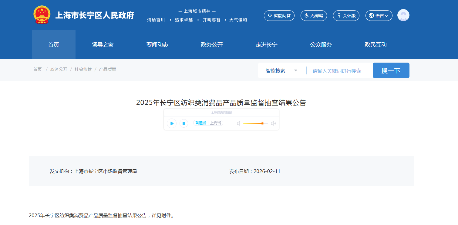 2025年长宁区纺织类消费品产品质量监督抽查结果公告